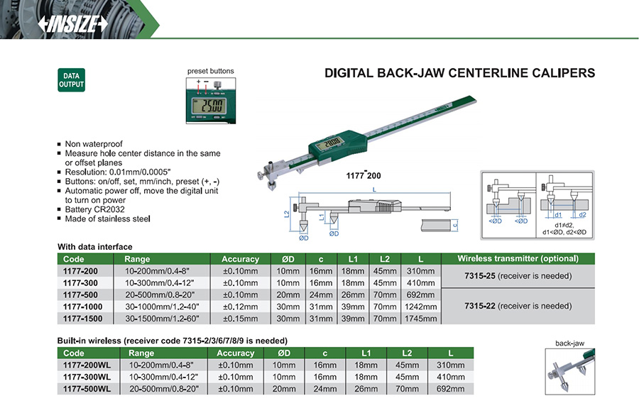 | 1177-200WL | 10-200mm/0.4-8" | ±0.10mm | 0.01mm/0.0005" | built-in wireless |