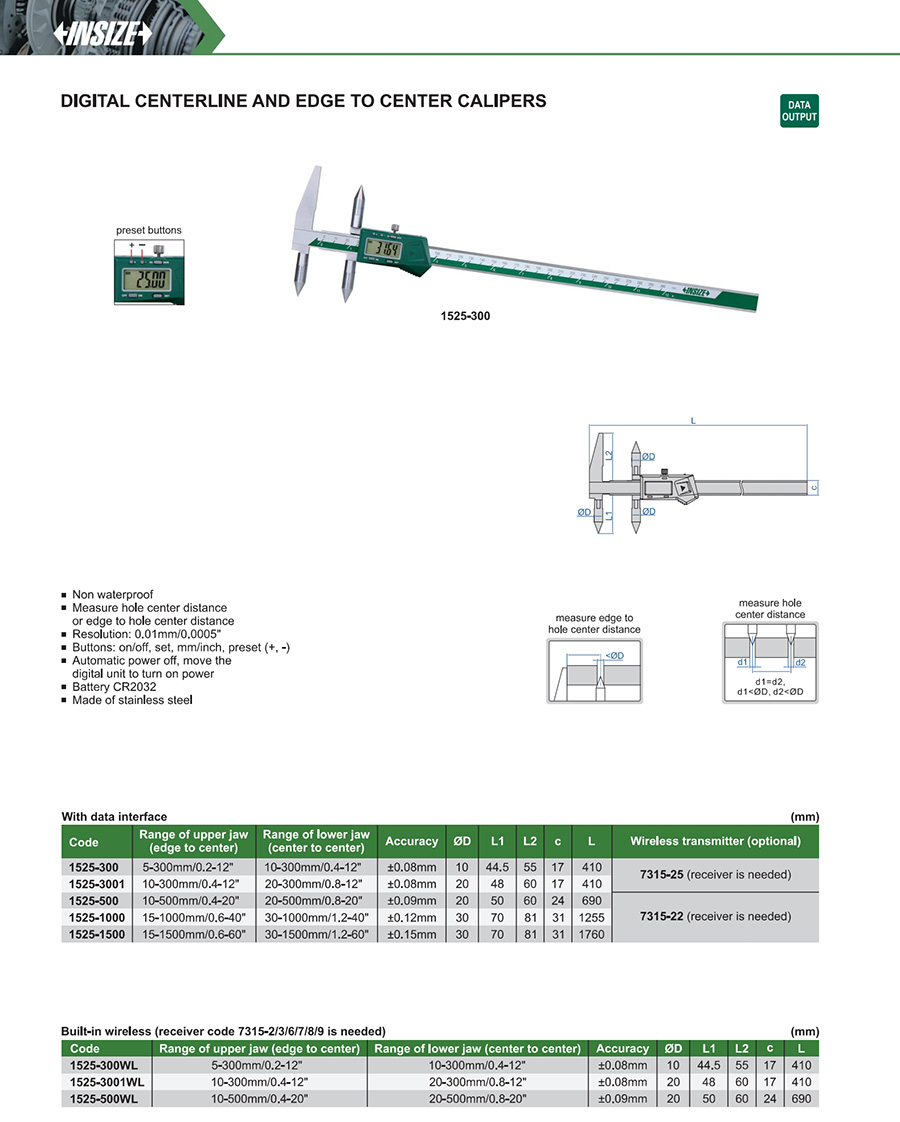 | 1525-3001 | edge to center: 10-300mm/0.4-12" | center to center: 20-300mm/0.8-12" | ±0.08mm | 0.01mm/0.0005" | with data interface |