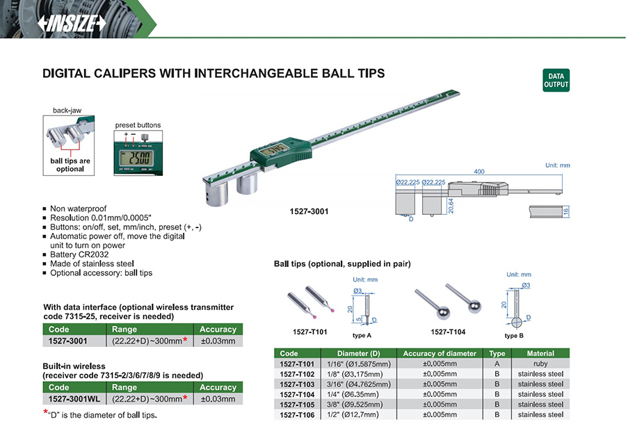 | 1527-3001WL | (22.22+D)~300mm | ±0.03mm | 0.01mm/0.0005" | built-in wireless |