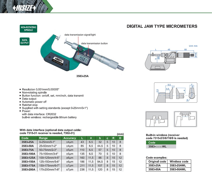 | 3583-75A | 50-75mm/2-3" | ±5μm | 0.001mm/0.00005" | with data interface |