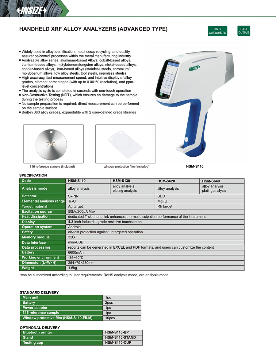 Analyzable alloy series: aluminum-based Alloys, cobalt-based alloys, titanium-based alloys, molybdenum/tungsten alloys, nickel-based alloys, copper-based alloys, iron-based alloys (stainless steels, chromium/molybdenum alloys, low alloy steels, tool steels, seamless steels)