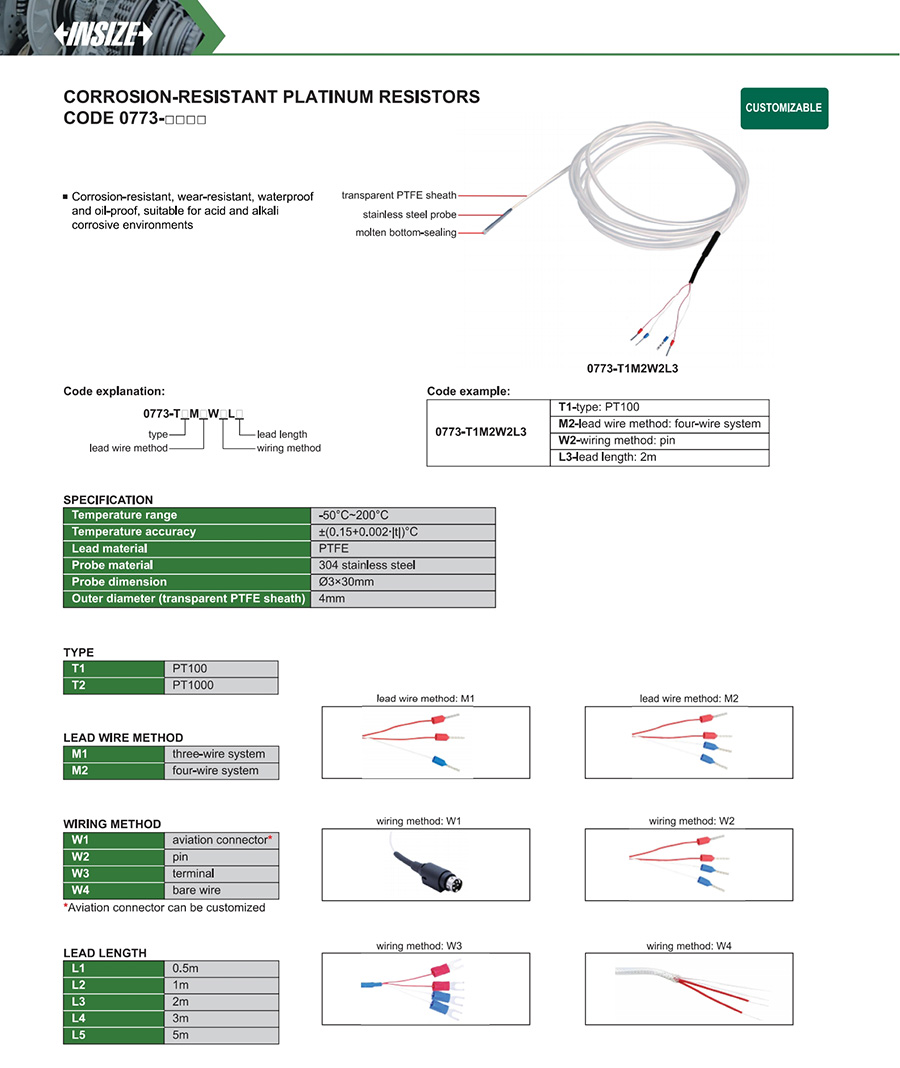 0773-□□ PT100, PT1000 platinum resistor -50°C~200°C ±(0.15+0.002∙|t|)°C