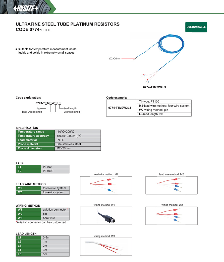 | 0774-□□ | PT100, PT1000 | platinum resistor | -50°C~200°C | ±(0.15+0.002∙|t|)°C |