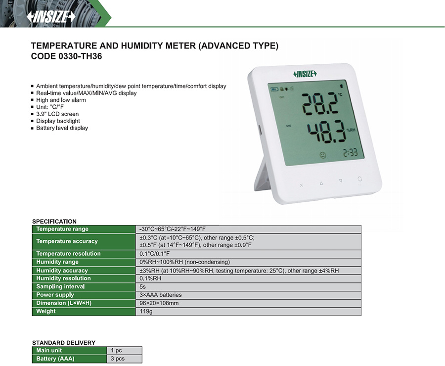 0330-TH36 digital internal ±0.3°C(at -10°C~65°C), other range ±0.5°C; ±0.5°F(at 14°F~149°F), other range ±0.9°F 0%RH~100%RH (non-condensing) ±3%RH (at 10%RH~90%RH, testing temperature: 25°C), other range ±4%RH yes -30°C~65°C/-22°F~149°F