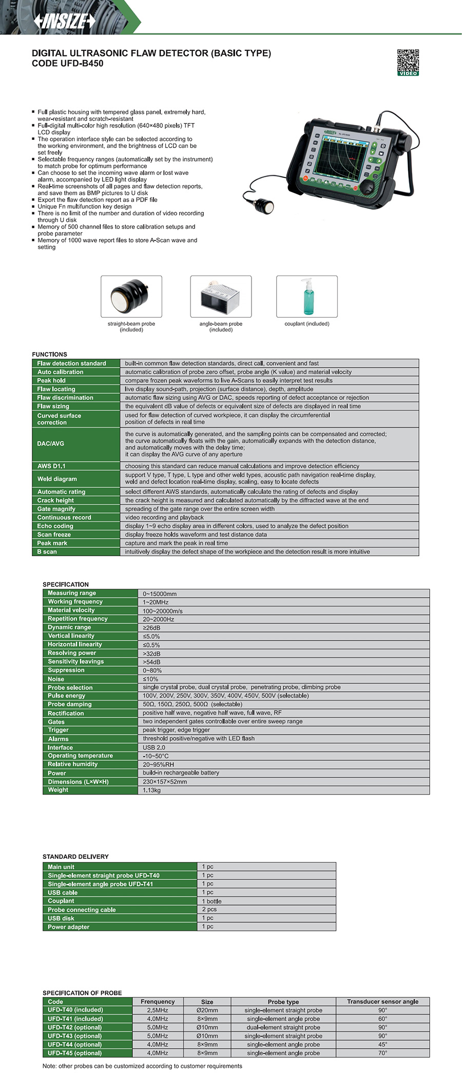 | UFD-B450 | 0~15000mm | 1~20MHz | ≤5.0% | ≤0.5% | ≥26dB | ˃32dB | ˃54dB |