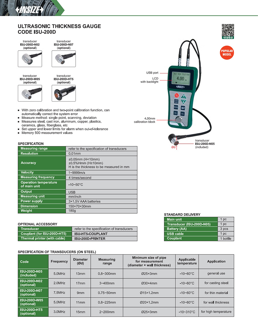 | ISU-200D | 0.8~300mm | ±0.05mm (H<10mm), ±0.5%Hmm (H≥10mm) | 5.0MHz | USB | 1~9999m/s | 13mm |