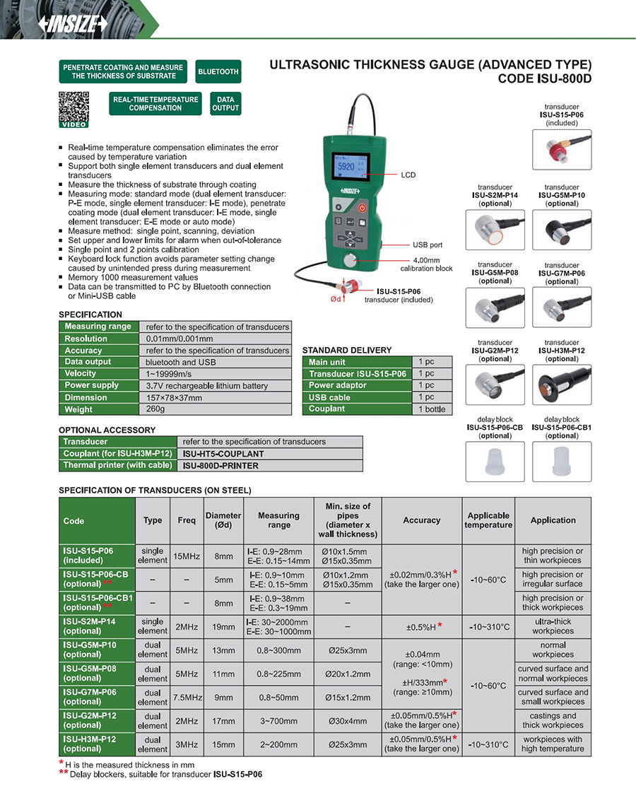 | ISU-800D | I-E: 0.9~28mm, E-E: 0.15~14mm | ±0.02mm/0.3%H | 8mm | 15MHz | bluetooth and USB | 1~19999m/s |