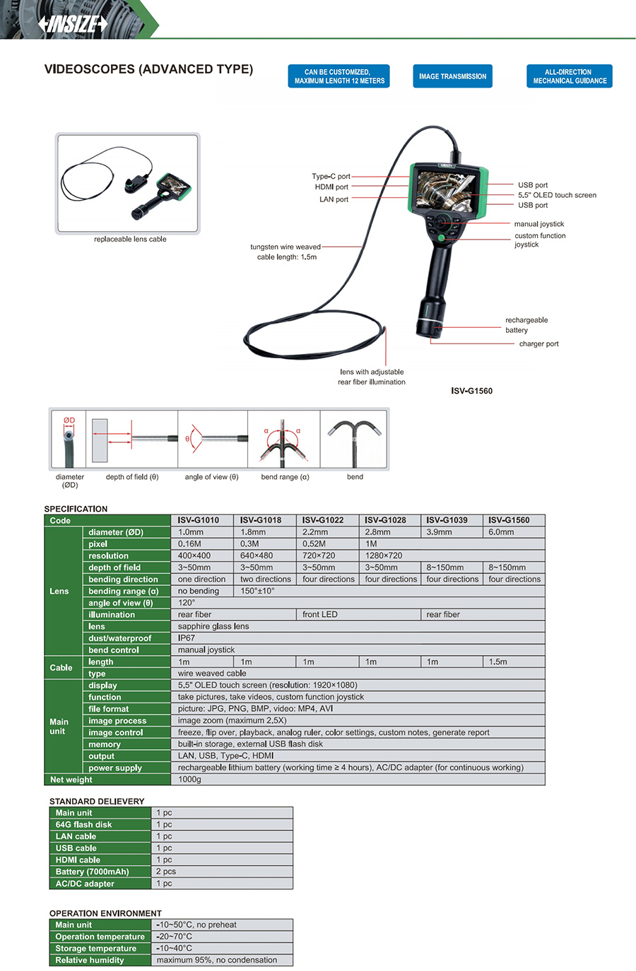 | ISV-G1022 | 0.52M | tungsten wire weaved cable | front view | 2.2mm | 1m | four directions | front LED |
