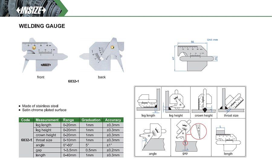 | 6832-1 | 0-10mm | ±0.3mm | 1mm | throat size |